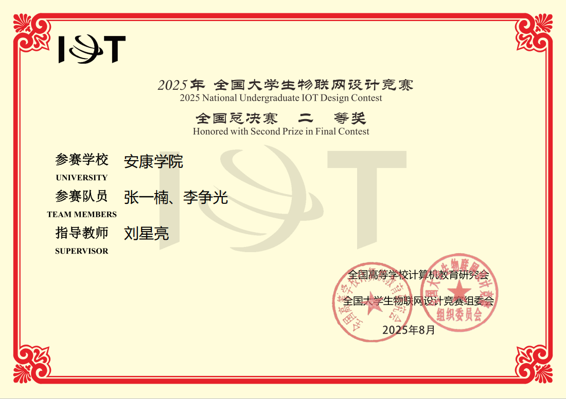 近日,2025年全国大学生物联网设计竞赛全国总决赛结果公布。电信学院刘星亮老师指导的学生张一楠、李争光表现出色,参赛项目在西北赛区荣获一等奖后成功入围全国总决赛,最终荣获全国总决赛二等奖。