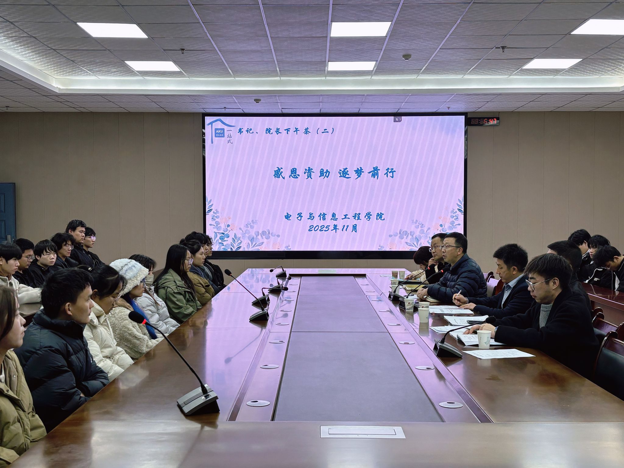 11 月 26 日下午,电信学院在逸夫科技楼 9 楼大会议室举办 “书记院长下午茶” 系列活动(二)——“励志逐光,聚力同行” 国家助学金学生座谈会。活动紧扣国家助学金政策要求,搭建学院与受助学生的深度沟通桥梁,学院党政班子成员、学工办人员及 2023-2025 级 60 余名获助学生代表参会,党总支副书记蔡正旺主持会议。