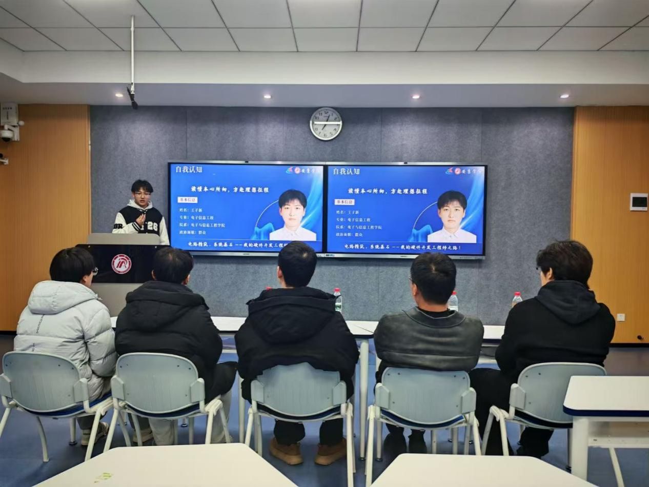 赛前,学院高度重视本次初赛工作,通过主题班会、专业群通知、微信公众号等多渠道广泛动员。比赛现场,来自不同年级的参赛选手依据所选赛道依次登台展示。成长赛道上,本科一至三年级学子围绕“软件开发”、“嵌入式开发工程师”等职业目标,结合专业课程学习、科创竞赛经历及暑期实践成果,清晰阐述职业规划的形成过程与实施路径,展现出扎实的专业认知与积极的成长姿态。其中,2023级电子信息工程专业学生李思宇同学以“从单片机入门到嵌入式开发”的成长故事为切入点,分享了通过参与“助盲者计划”项目提升实践能力的经历,其清晰的目标导向与持续行动意识获得评委一致认可。