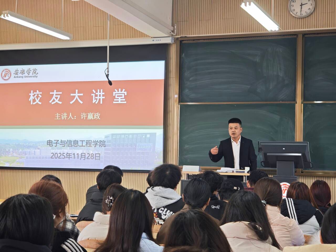 2025年11月28日下午,电信学院在1304教室成功举办了“校友大讲堂”活动。本次活动特别邀请了学院优秀校友、2013届电子信息技术毕业生许嬴政担任主讲嘉宾,他以自身成长与创业经历为蓝本,为在校学子带来了一场兼具深度与温度的精彩分享,为母校人才培养与家乡高质量发展注入新动能。