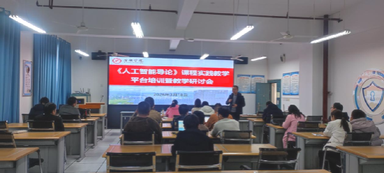为扎实推进2026年春季学期《人工智能导论》课程实践环节教学工作,凝聚集体智慧优化实践教学,提升实践教学质量。3月18日下午,《人工智能导论》课程实践教学平台培训暨教学研讨活动在逸夫科技楼B602顺利召开,课程团队全体教师成员齐聚一堂,以研促教、共话提升。本次活动由信息技术教研室主任李宝主持,副院长宋权华及课程教学团队全体教师参加。
